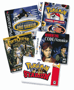 As you probably know there are millions of different games out there, but they all come down to fit in to these 8 catigories. RPG or role playing game (Golden sun)Action (007 agent under fire) first person shooter (counter strike) Arcade (miss pac-man) Raceing (mario cart) Adventure (mario) Fighting (capcom VS. SNK 2:EO) And Puzzle (tetris).